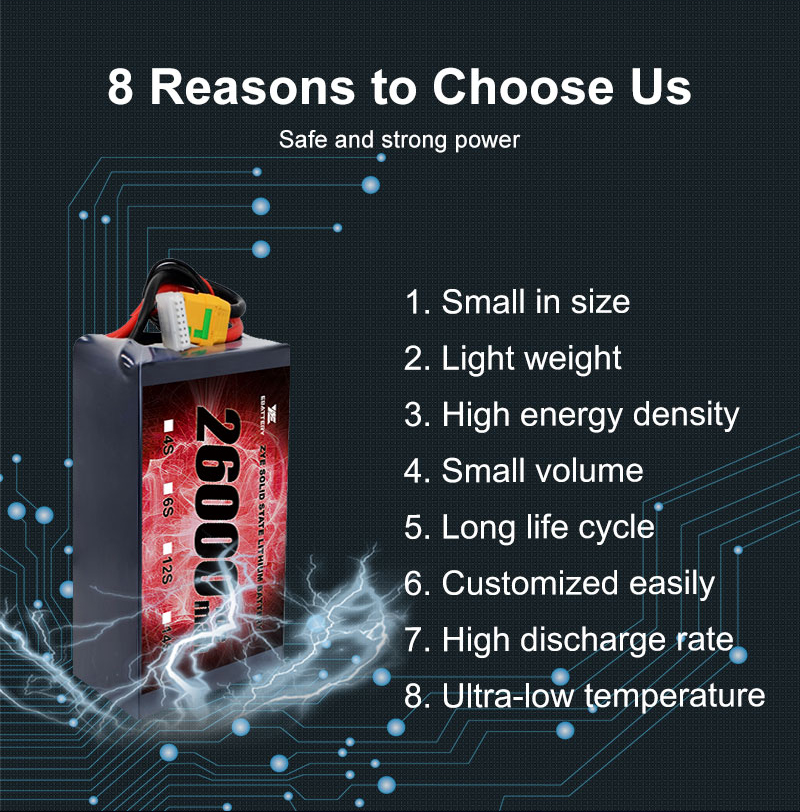 Врхунска технологија: Наше чврсте батерије представљају најновије напредовање у технологији батерије, нудећи врхунске перформансе и безбедност, укључујућиГустина високе енергије 22АХ 20Х 22000МАХ 10Ц 20Ц СОЛИД ДРЖАВНА ЛИ-ИОН батерија за дуге дроге.