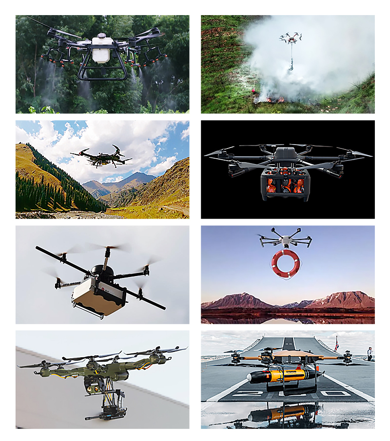 Испорука, јавна безбедност и пољопривреда захтевају више снаге за полетање и маневрисање, тако да су ЛиПо или ЛиХВ решења са високим пражњењем и даље уобичајена.